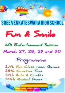25 Mar Fun & Smile – KG Entertainment Session Posted at 07:57h in Events, News & Updates by Sree Venkateswara School 107 Likes KG Entertainment Session FUN & SMILE We invite all our KG kids for this programme. Tags: Awards