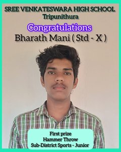 09 Oct congratulations….. Posted at 05:03h in Events, News & Updates by Sree Venkateswara School 107 Likes Congratulations Bharath Mani of standard 10 won the First Prize for Hammer Throw in the Junior category at the Sub District level Sports. Tags: Awards